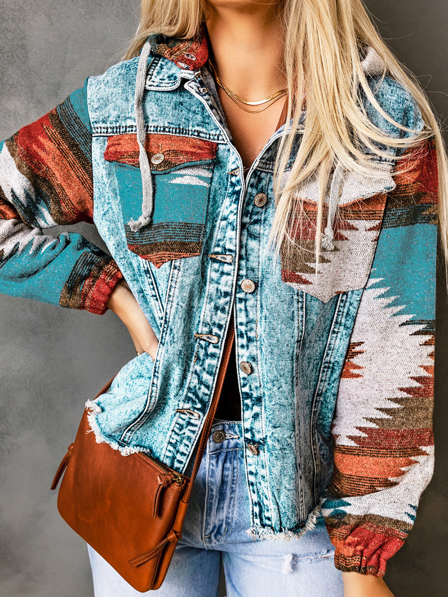 Western Style Denim Stitching Hooded Jacket Multi-color Printed Frayed Hem Jacket